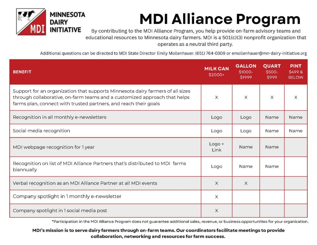 Minnesota Dairy Initiative is launching the MDI Alliance Program and is seeking allied partners. Alliance contributions directly support Minnesota dairy farmers as they plan for long-term success. MDI’s farms depend on their on-farm teams to make informed decisions and succeed, and the MDI Alliance Program helps ensure those teams remain in place for years to come.